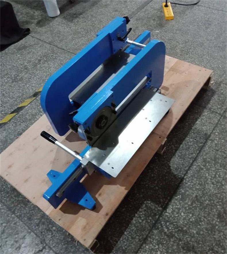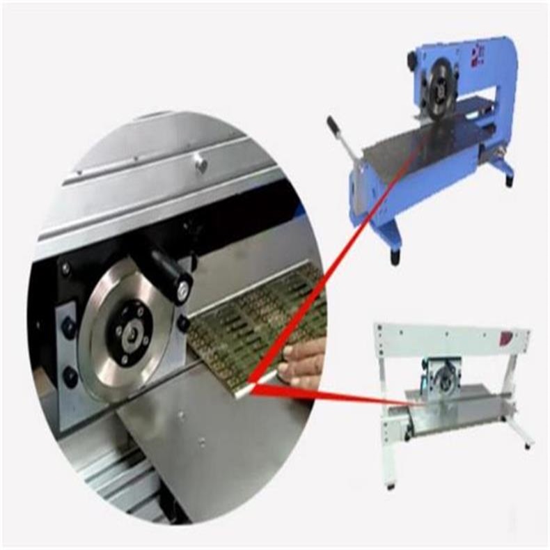 將要進行分切的V-CUT連板的V形槽對準下切刀的刀刃口,然后手推手柄,下切刀沿線性導軌前后移動,圓形刀被動旋轉,從而將V-CUT連板分離。